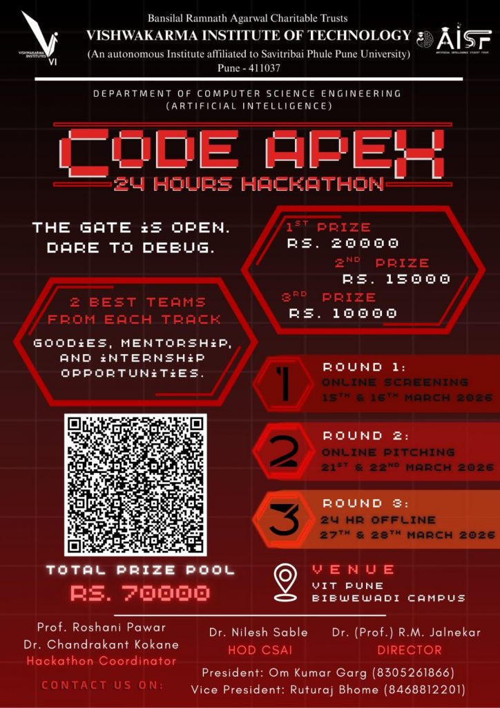 We are proud to share that the *Department of CSE (AI) at VIT Pune* successfully organized Hackathon *Code Verse from on 24 September and 25 September 2025 a continuous 24 hours coding Hackathon under the banner of VIT Code Apex.