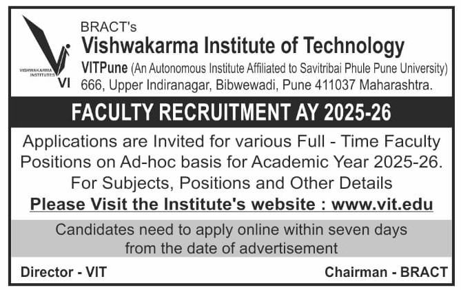 At Vishwakarma Institute of Technology, Pune, we believe great educators are the cornerstone of transformative learning. If you are passionate about academic excellence, innovative research, and shaping the leaders of tomorrow, we invite you to be part of our esteemed faculty community.